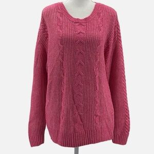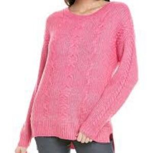 Cabi Elsa Cable Knit Crewneck Pullover Sweater in Pink - Size Medium. Good pre-owned condition. Minor signs of wear, little bit of pilling. Ribbed at neckline, hem and sleeve cuffs. Split sides at hem. Back is a little longer than the front. Seems to be a little bit oversized. Please refer to measurements provided to ensure fit. Approximate measurements: 22" pit to pit, 28" length to front hem. Measurements taken laying flat.