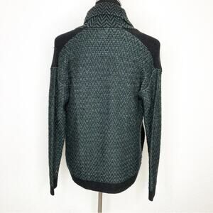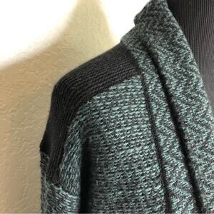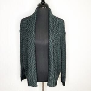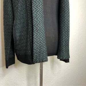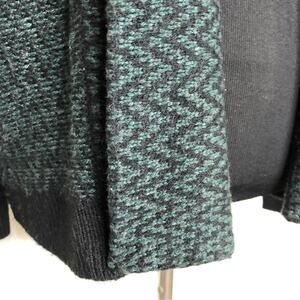 Cabi Fireside green and black cardigan sweater. Full open front with shawl collar. Knit chevron pattern. Double side pockets. Ribbed hemline and sleeve cuffs. Size Small. Very good preowned condition. Minor wash wear. A few discolored threads on sleeve as shown. #3015.