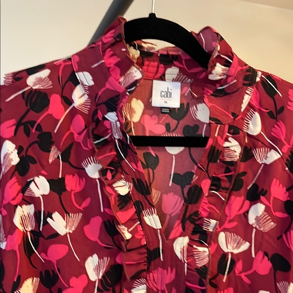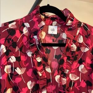 Chic Cabi blouse with vibrant floral pattern. Features ruffle details and a stylish design.
