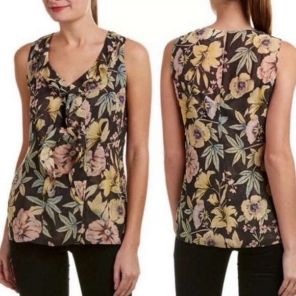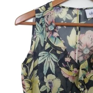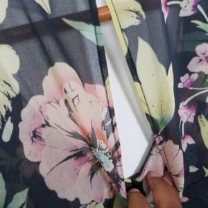 Semi-sheer. Ruffles on neckline and down the front, slit opening on the back. Dark charcoal gray color.