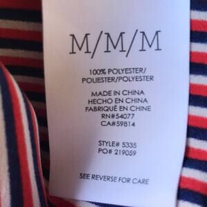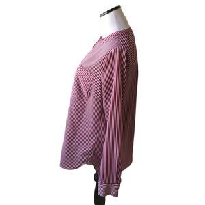 Cabi Franklin red striped v neck blouse. Loose fit. Chest pockets. Shirttail hem. Cuffed sleeves. Polyester. Machine wash. Style 5335. In preowned condition.