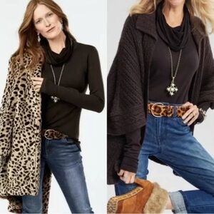 This CAbi sweater features a striking combination of a solid chocolate brown body and bold leopard print sleeves, creating a unique color-blocking effect. The turtleneck design adds a touch of elegance, while the relaxed fit ensures comfort and style. Perfect for adding a statement piece to your wardrobe, this sweater effortlessly blends classic and contemporary elements.(N