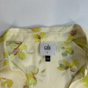 The CAbi Go To Blouse in small size is a yellow floral print blouse with a button front and 3/4 sleeves. It has a collared neckline and is made of polyester material. The blouse is machine washable and suitable for travel, casual, and business occasions. Its pattern and color make it a perfect choice for summer, fall, and spring seasons. The blouse fits regular and is a basic style that can be paired with different clothing items.