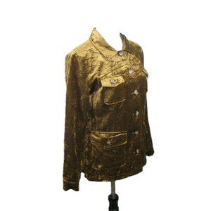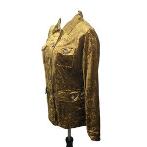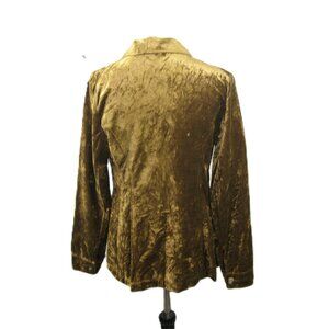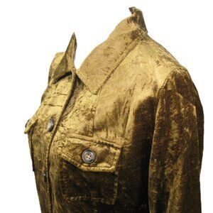 This button front blazer is in excellent condition, like new, but missing the materials tag, no notable flaws. This has a crushed velvet appearance. It has two button flap pockets on the front and epaulettes on the shoulders. This has one button closure on the cuffs.