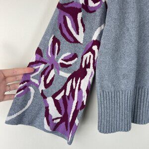 Cabi Gray Floral Flare Sleeve Eden Pullover Turtleneck Sweater. Flare bell sleeve. Floral intarsia knit detail. Cotton blend. Size Medium. Armpit to armpit: 19.5". Armpit to end of sleeve: 15.5". Length: 21.5". (189)
