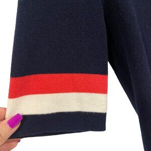Nautical-themed Cabi Hampton Shell short sleeve sweater in navy blue knit. Features red and white stripes along the hem, sleeves, and back. Size M. Good condition.