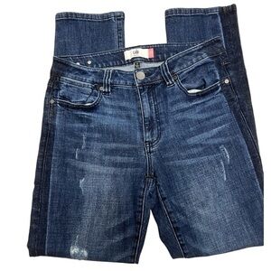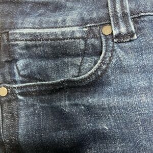 Jeans have a darker stripe down outside leg distressed thigh knee tuxedo stripe