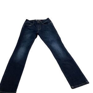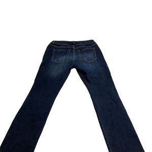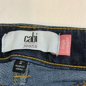 Keywords: Cabi, women's jeans, straight leg, dark wash, casual, dress-up, versatile, denim, classic, pre-owned, size 2, blue jeans, five-pocket design, zip fly, button closure.