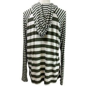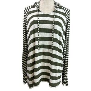 Cabi Striped Playoff Hoodie pullover in green / heather oatmeal stripe, soft and stretchy, drawstring hood, side slits, thumbholes, v-neck, raglan sleeves, rayon/spandex blend, longer length. Great pre-owned condition. Offers welcome!