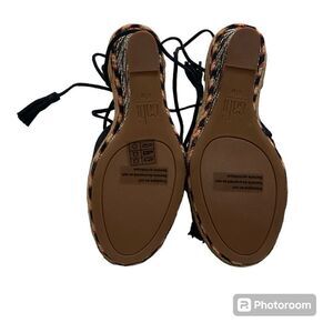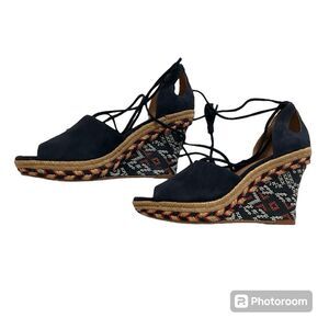 Cabi Isla Espadrille wedge sandal NWOT. Size 6 1/2. Navy blue suede ankle tie Aztec print.