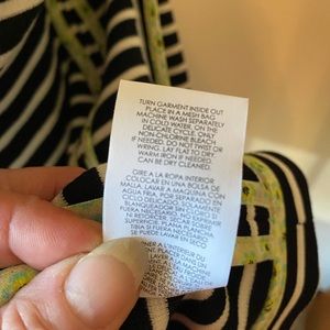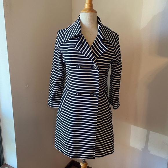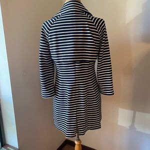 Mid length knit blue/black and white stripe double breasted jacket with pockets