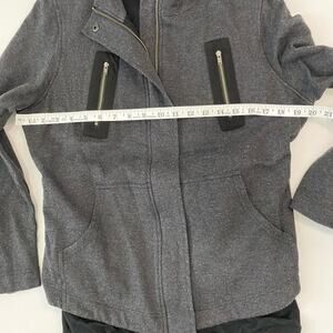 This lovely stylish Cabi Jacket is in good used condition. There is some distressing on the black D loop that is on the back of the jacket, as shown in photos. It is gray and black, with a black ruffle at the bottom of the jacket. It is a size small and measurement photos are included.