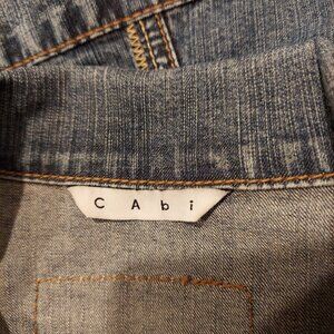 This stylish Cabi Jean Jacket for women in medium size offers a chic retro look. The blue denim jacket features a cropped design, long sleeves, waist tabs, and a distinct Cabi logo and buttons. Perfect for a beachy, casual outfit.