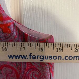 Beautiful Cabi Jubilee Paisley Top. Fully double lined top with flattering paisley pattern in stunning hues of pinks, oranges, etc. Sleeveless, rounded neckline, rounded hemline, exposed zipper in back and longer tunic length. 100% polyester. Perfect for the office with pearls, or wear with jeans. Original Retail $89.