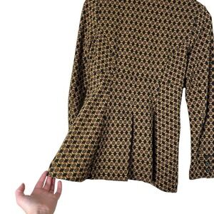 Features: tailored silhouette, collared neckline, fitted waist, pockets, 3 button front, 3 button at cuffs, center back vent, cotton blend knit fabric, medallion motif. Color: mustard yellow and navy blue.