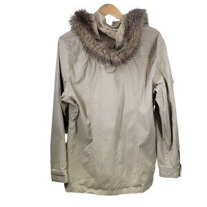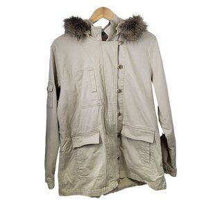 Womens Beige Hooded Parka Jacket With Faux Fur Trim & Multi-Pockets