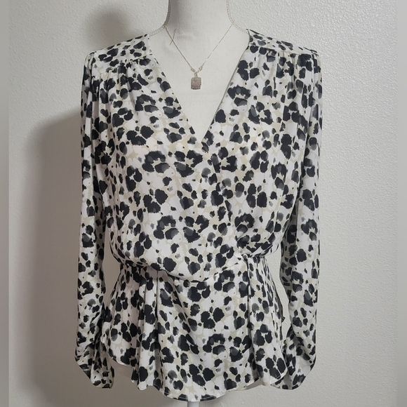 Cabi Leopard print wrap style roushing on sleeve top size small