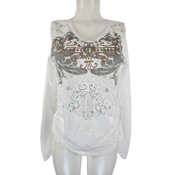 Cabi Lightweight Burnout Waffle Knit Ruched White/Gray/Gold Long Sleeve Top L