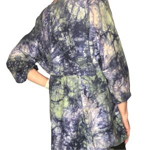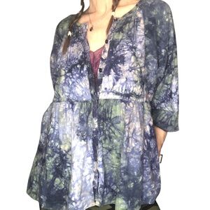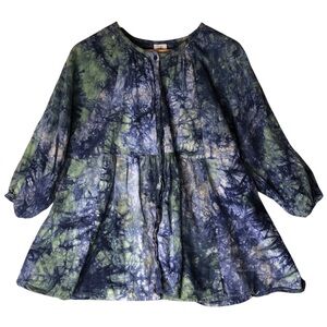 This Cabi blouse is a comfortable and stylish piece made from a linen blend. It features a flattering babydoll silhouette with a peplum detail, and it has a button-up front. The size is Medium, and the color is a beautiful mix of Royal Blue and Green.