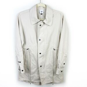 Features: Beige, linen-blend parka, oversized pockets, drawcord detail at waist, snap cuffs, hits at mid thigh