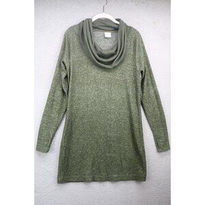 This is a Cabi Long Sleeve Cowl Neck Olive Green Dress that is a size XS. It has thumbholes and a drawstring in the back. It is 66% Rayon, 31% Polyester, and 3% Spandex. Laying flat, it measures: Armpit to armpit-20" and the Length is 34.5". In great condition.