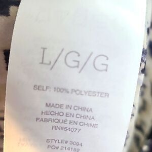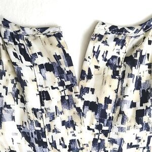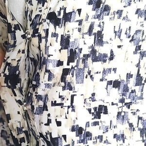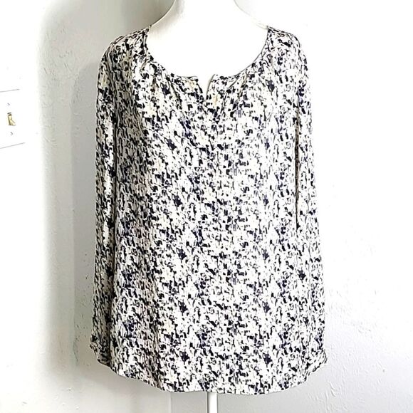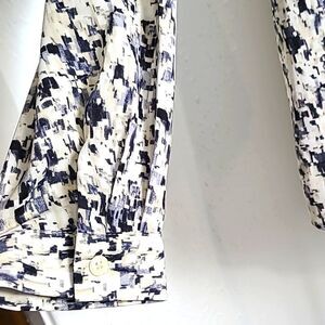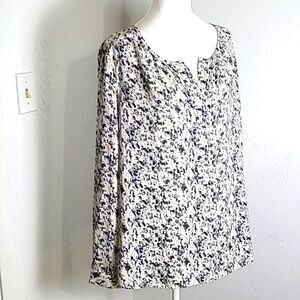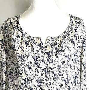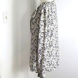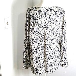 Cabi Longsleeve Blouse White, Black, Blue & Cream Print, Open V-neck, Size Large