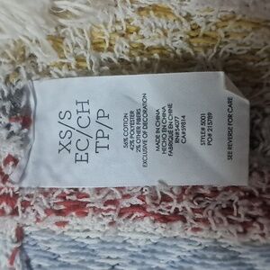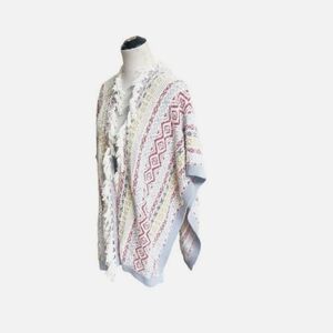 Stylish oversized knit open front cardigan cape with fringe details. Features a multicolor pattern, including red and cream. Boho Bohemian Festival Beach Vacay Vacation Resort Preowned