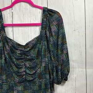 Cabi Multicolor Ruched Puff Sleeve Dress Size Large Mesh Overlay Style 4214