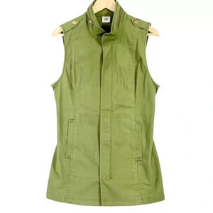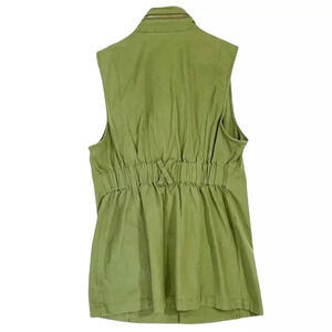 Long line, zip front utility/military style vest. Exposed gold full length zipper.