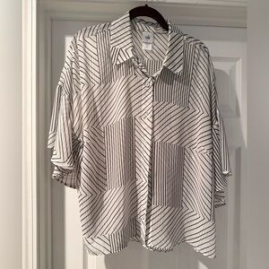 Sheer chiffon short sleeved button front blouse. White with broken black stripe pattern. Flouncy sleeves. Boxy shape.