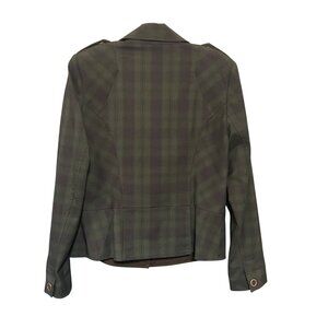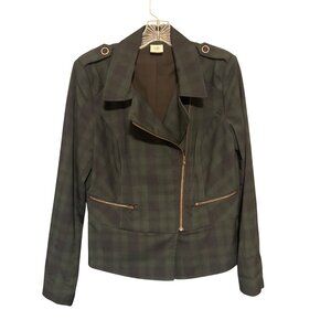 This plaid moto jacket tells a tale of edgy sophistication. Gold-tone zipper accents glisten against a deep green and blue plaid, blending modernity with timeless style. With its tailored fit and striking details, this piece encapsulates confidence and grace, making it an essential addition to those who appreciate subtle boldness.