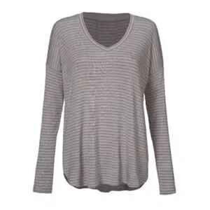 Thin purple stripes are cast against a warm gray ground to create the Plum Tee. Features include an oversized shape with an exaggerated high-low shirttail hem. The minimalist stripe pattern reads as a neutral from afar, making it ideal to experiment with print mixing.