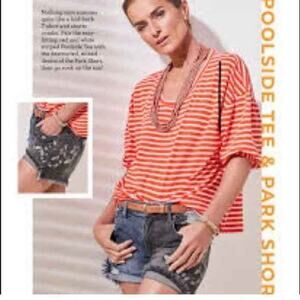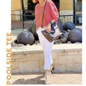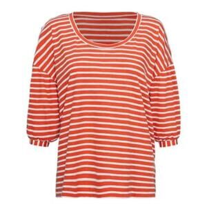 CAbi orange and white striped top with puffy sleeves. This is a very roomy size small top.