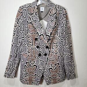Cabi Python Blazer with snake print. Style #3733 Show off your personality! This print is loud, proud and versatile with its neutral colors. Size 8. Gray tan black white. This blazer has a double breasted six button closure with lapels and button accents on cuffs. 82% rayon 11% nylon 7% spandex. Measures 19" across pits and 28" from top of shoulder to hem. Nonsmoking home with awesome pugs and a crazy bulldog.