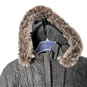 Cabi Quilted Black Jacket Faux Fur Red Lining XL Removable Hood Snap Full Zip