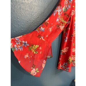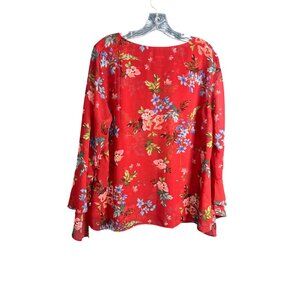 Cabi Red Floral Blouse Size L Keyhole Neckline Long Bell Sleeves