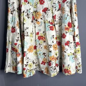 This Cabi skirt is a charming and versatile piece. This skirt has a white background with predominantly red and brown palette.