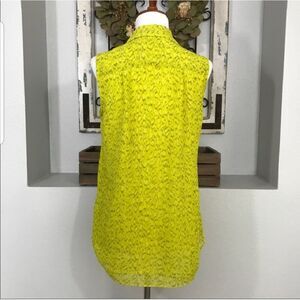 Cabi Reign sleeveless ruffle-front tank in chartreuse yellow with grey. Double lined for coverage. High low hem. Button front. Colorful addition to any wardrobe. Size X Small, tag marked with silver sharpie. Excellent preowned condition.