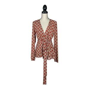 Cabi Ringleader Wrap Top in a size medium. Has a full wrap front with a matching tie belt. Measures approximately 19 1/2” armpit to armpit, and 26” in length. 94% nylon, 6% spandex. In great condition.