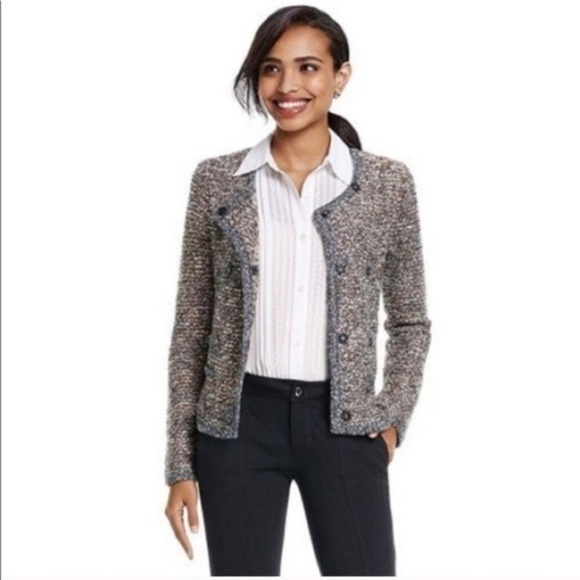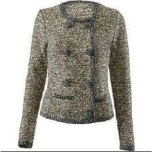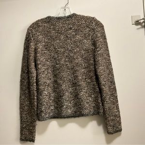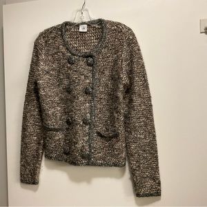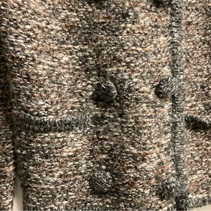 Chunky knit, warm button knit snap, double breasted, mix of grey and brown. This sweater is vintage but it is in excellent shape, like new.
