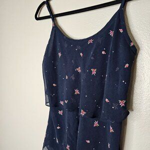Navy blue floral print tiered tank top with adjustable spaghetti straps.