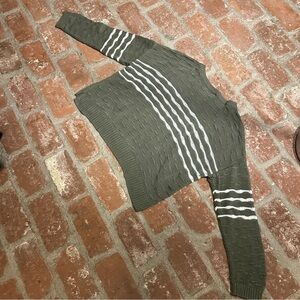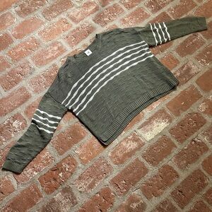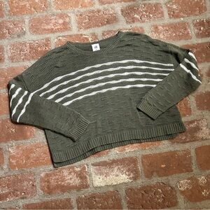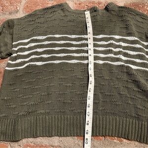 The Scout pullover is in an olive hue with white stripes across the chest. This open weave sweater is a perfect airy lightweight layer. Super soft 99% cotton and 1% other. Boxy shape, slightly cropped depending on your height with a crew neckline. Skin yarn, imperfect in some spots as pictured. See photos for approximate measurements.