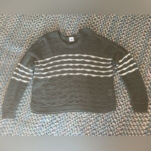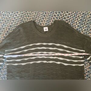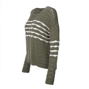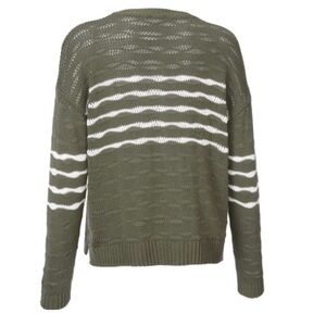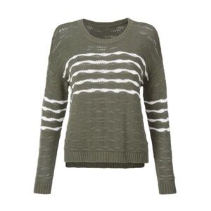 Chic olive sweater with white stripes. Ideal for casual wear.
