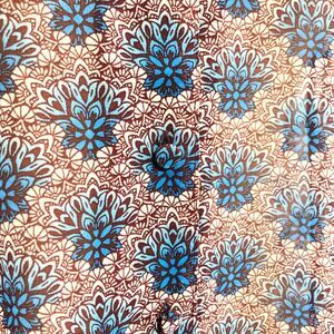 Sheer polyester blouse with all over dark res and blue fan pattern