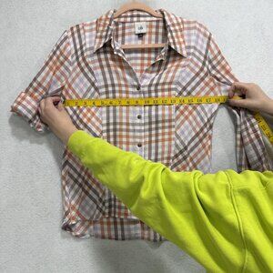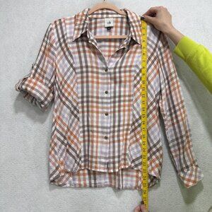Cabi Shirt Womens Small Brown Orange Purple Plaid Button Front Roll Tab High Low