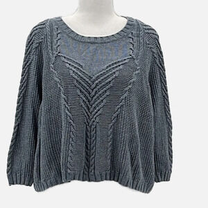 Cabi Short & Sweet Cropped Cable Knit Sweater in Dusty Blue - Size Small. Excellent pre-owned condition. Cropped, relaxed boxy fit, 3/4 sleeves, color is a mix of blue and gray. Approximate measurements: 26" pit to pit, 19" length from shoulder, laid flat. Style 3481