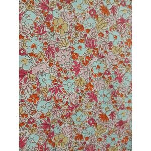 Colorful casual blouse from CAbi in size medium. Made from cotton and spandex this blouse features long sleeves and has a collared neckline. It has a bright floral print in pinks and blue on a white background. The long sleeves and in two-button barrel cuffs. The chest measurement is about 40 in. From the shoulder to the hem measures about 23 in.