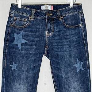 Cabi Slim Boyfriend Jeans in Celebrity Star Wash - Size 2. Excellent pre-owned condition. Boyfriend cut, slim fit, zip fly with button closure, 5 pockets, some stretch, raw fringed hem, darker wash at leg hems, star pattern throughout. From Fall 2020 collection. Approximate measurements: 15 1/2" waist, 8" rise, 29" inseam.