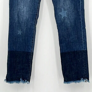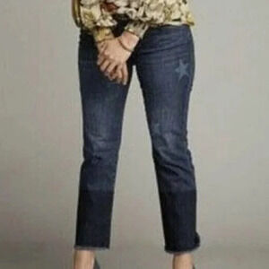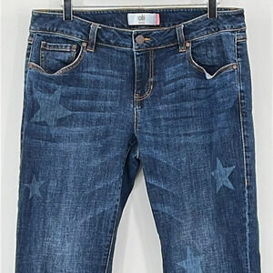 Cabi Slim Boyfriend Jeans in Celebrity Wash - Size 8. Excellent pre-owned, like new condition. Boyfriend fit, zip fly with button closure, 5 pockets, stretch, dark wash with whitewash stars, darker wash on lower legs, raw hem, contrast stitching. Approximate measurements: 17" waist, 9" rise, 29" inseam. Style 3937