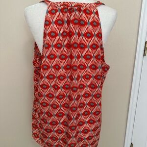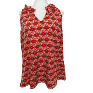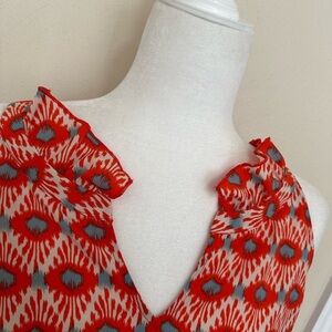 Excellent condition, machine washable. Flattering halter cut with delicate ruffle at neckline. Aqua and coral with cream.